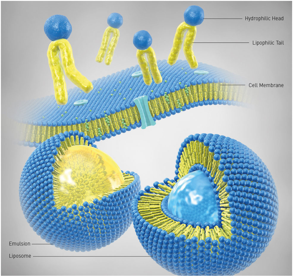Depiction of phospholipids in an aqueous environment, an emulsion (phospholipid monolayer encapsulation of lipophilic ingredients), and a liposome (phospholipid bilayer encapsulation of hydrophilic ingredients).